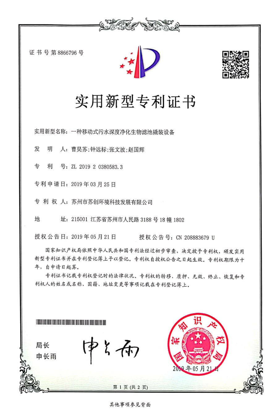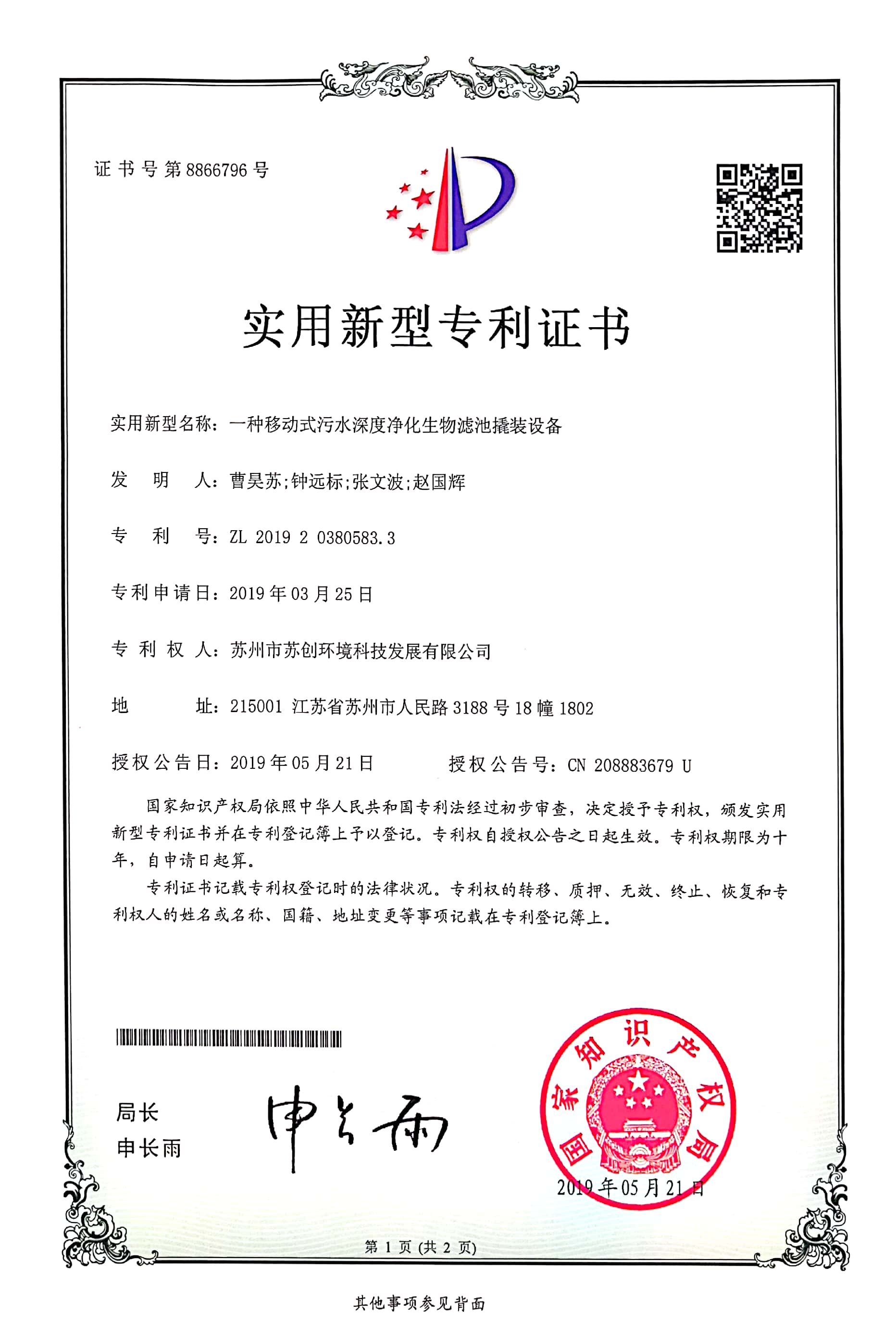 磁分離+反硝化+曝氣生物濾池一體化裝備 采用磁沉淀和曝氣生物濾池相結(jié)合的水體凈化工藝蘇創(chuàng)環(huán)境 · 專利與榮譽成果
